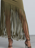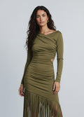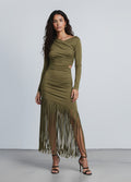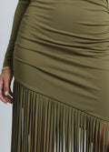 The Desert Fringe Ruched Midi Dress brings festival chic to refined evening wear. An off-shoulder neckline and strategic ruching flatter; the asymmetric fringe hem adds movement.