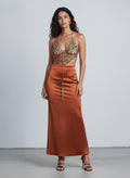 Shimmer meets sleek. The Jewel Cascade Beaded Halter Two‑Piece Set pairs a hand‑embellished halter crop top with draped beadwork and a smooth satin maxi skirt in a rich copper tone. The look balances sparkle with clean lines for a dramatic, modern finish.