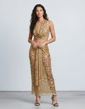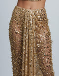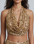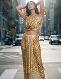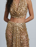 Channel full glamour with this Gold Sequin Draped Set — a stunning two-piece ensemble built to shine. The top features a draped cowl silhouette that accentuates your curves and adds movement, while the matching skirt flows with elegance and flair. Ideal for red carpet, special occasions, or any night you want to make a statement.