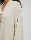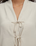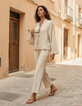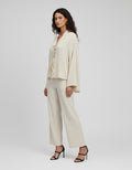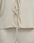 Relaxed sophistication made effortless. The Sofia Tie-Front Lounge Set brings soft tailoring to your everyday wardrobe with a breezy tie-front blouse and matching wide-leg pant. Designed in a smooth, lightweight crepe-style fabric, this neutral set drapes beautifully on the body — blending comfort and polish for days that move from home to out.