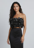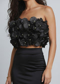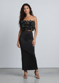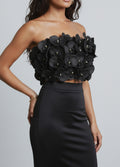 Romance meets modern edge in the Noir Garden Set. Dimensional floral appliqués bloom across a strapless crop top; the coordinating maxi skirt balances the texture with a clean column silhouette.