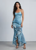 Breezy blue with dramatic movement. The Ocean Mist Ruched Ruffle High‑Low Dress features an adjustable cami bodice, sculpting ruching at the waist, and cascading ruffles that trace a high‑low hem. Subtle mesh panels add lightness and flow for a photo‑ready finish.