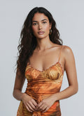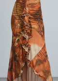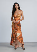 A vision in burnt sienna and golden-hour hues, the Sunset Reverie Maxi Dress captures romantic escapism. The adjustable cami bodice features delicate gathering while strategic side ruching sculpts an ultra-flattering silhouette. A hand-finished rosette anchors cascading ruffle trim along the asymmetric overlay with a whisper of mesh at the hem.